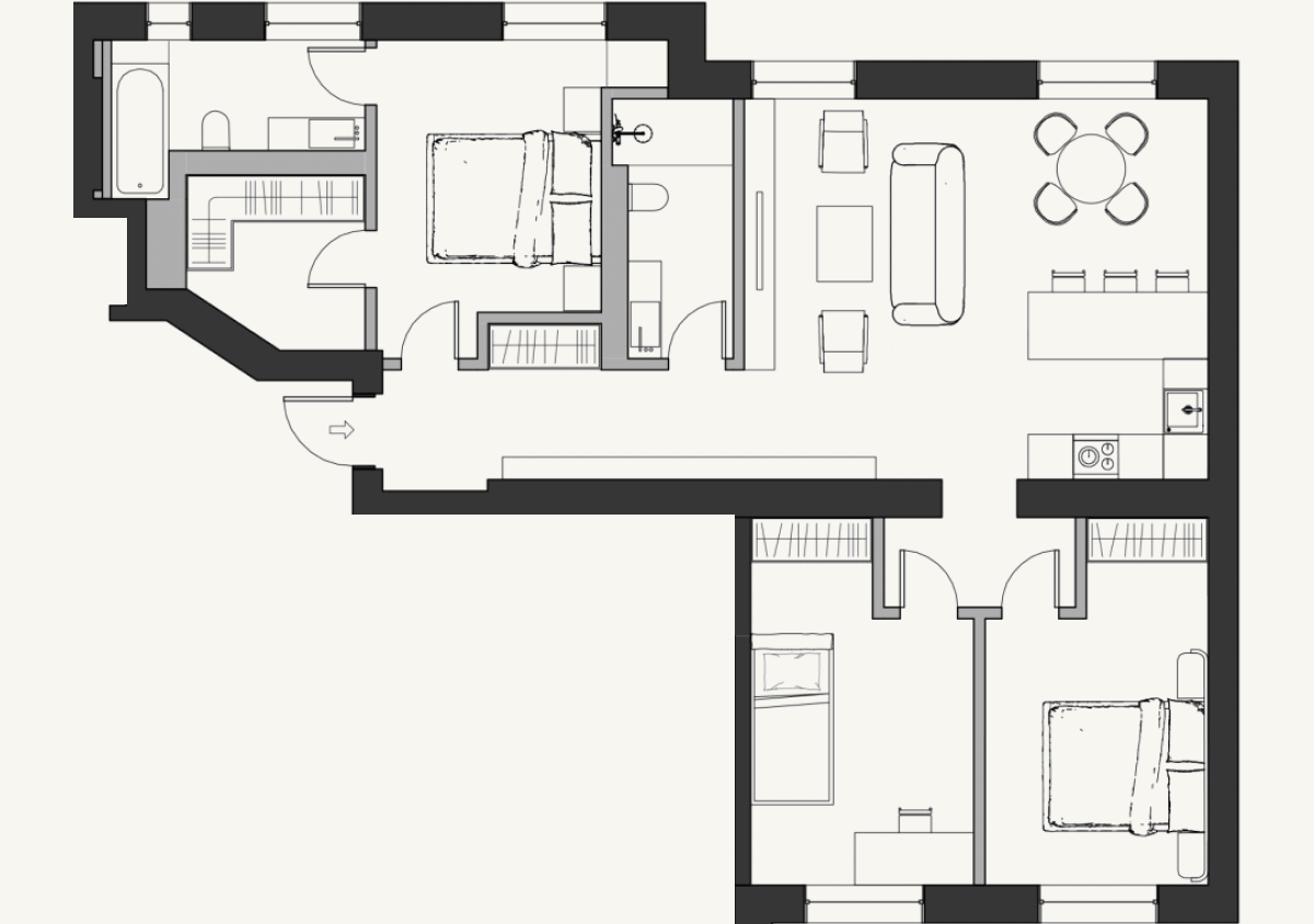 Dzīvokļi sagatavoti individuālai apdarei – bez starpsienām, lai katrs īpašnieks var pielāgot telpu atbilstoši savām vēlmēm un dzīvvestilam.